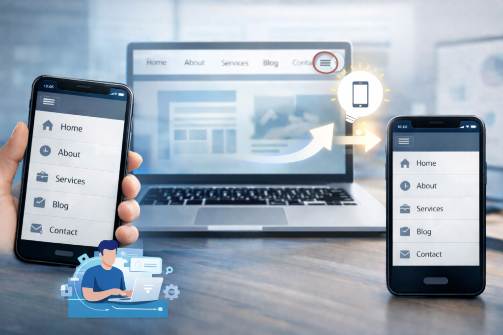 スマホでホームページを見ると、 「メニューが小さくて押しづらい」「パソコン用のままで使いにくい」「もっと分かりやすくしたい」 こんな悩みを感じたことはありませんか? スマホでは、パソコン用メニューをそのまま使うより、スマホ専用にシンプルなメ... -