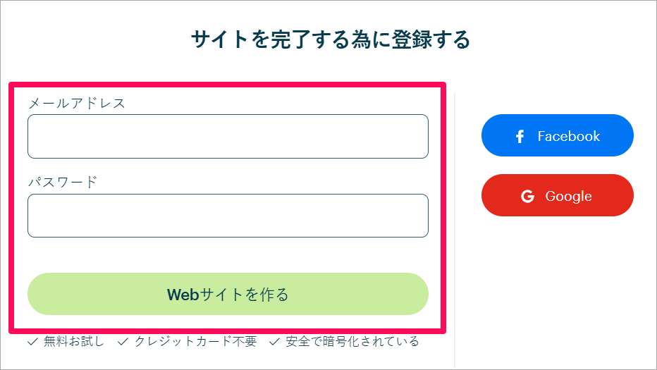 メールアドレスとパスワードを入力して、「Webサイトを作る」のボタンをクリックします。