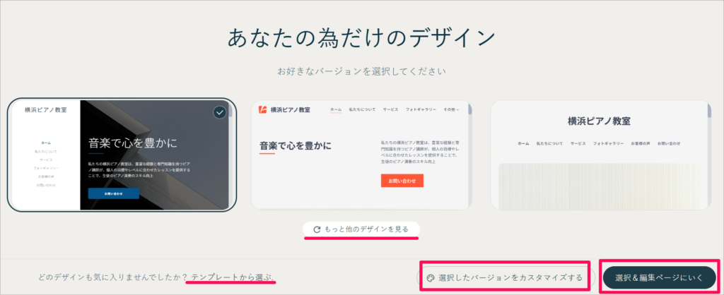 「あなたの為だけのデザイン」のページで、AIが作ってくれた、イメージに近いテンプレートを選びます。