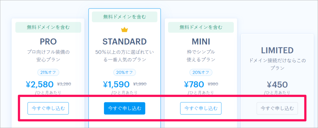たとえば、「LIMITED」プランであれば、「LIMITED」の欄の「今すぐ申し込む」をクリックします。