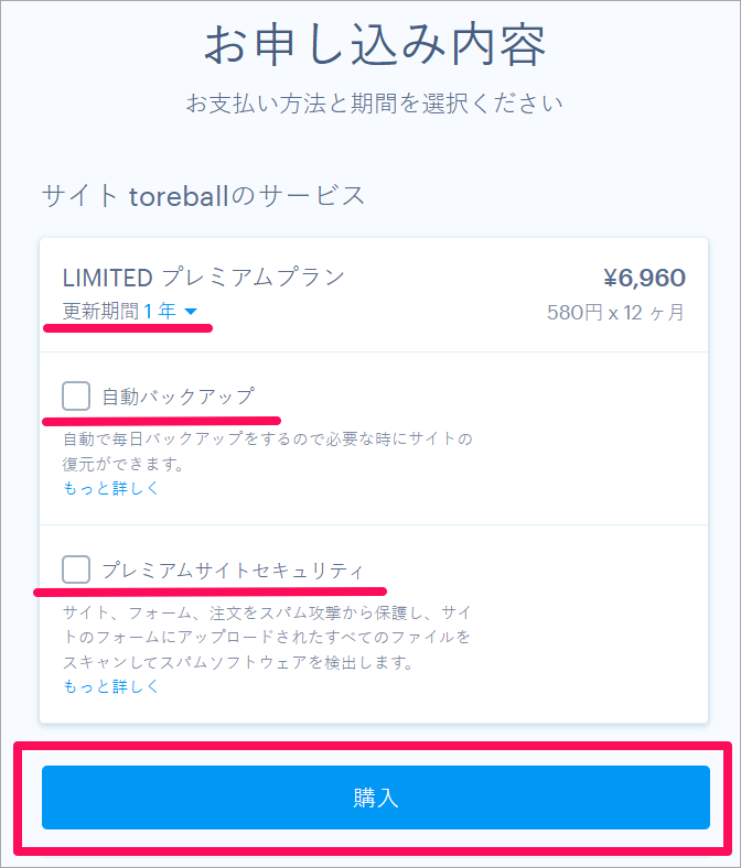 「更新期間」と、付けるオプション(自動バックアップ、プレミアプサイトセキュリティ)を選びます。