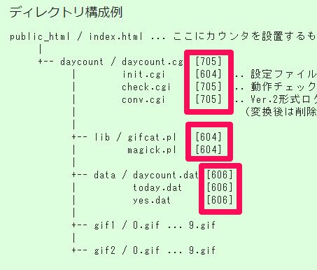 なお、各ファイルのパーミッションを変更するには、アクセスカウンターをダウンロードしたページの「プログラムの設定及び設置」の図を見ながら行います。