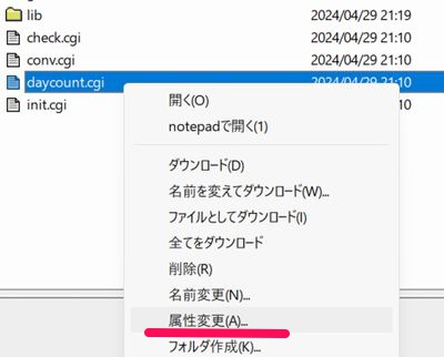 やり方は、FFFTPソフトの画面で、ファイルを右クリック ⇒「属性変更」をクリックします。
