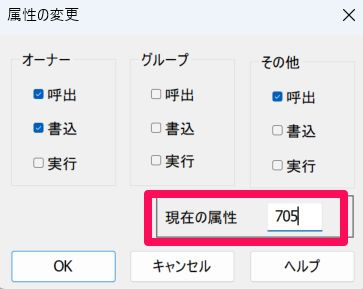 上記の赤い四角で囲った数字(705など)が、パーミッションです。