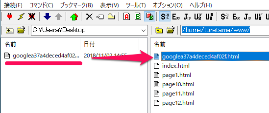 4.FFFTPソフトでレンタルサーバに接続して、index.htmlファイルと同じ場所に、ダウンロードしたファイル(googlea37a4deced4af02f.htmlというような名前)を、アップロードする。