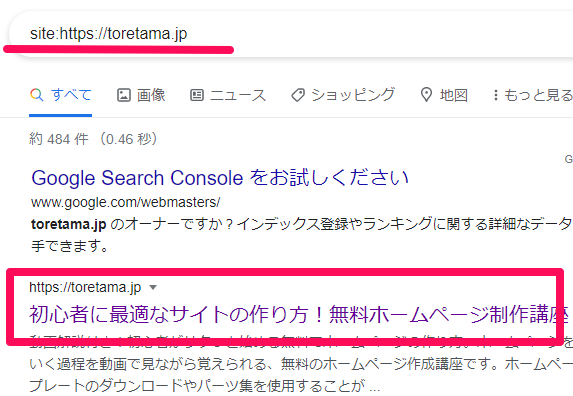 上記のように、自分のサイトが検索エンジンに表示されたら、「インデックスされている(登録されている)」ということです。