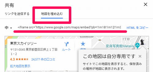 手順4:「地図を埋め込む」のタブをクリックして、表示されている