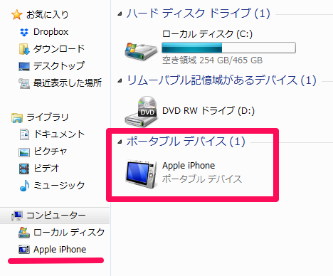 USBケーブルでつないだら、パソコンの「ハードディスクドライブ」の個所に、