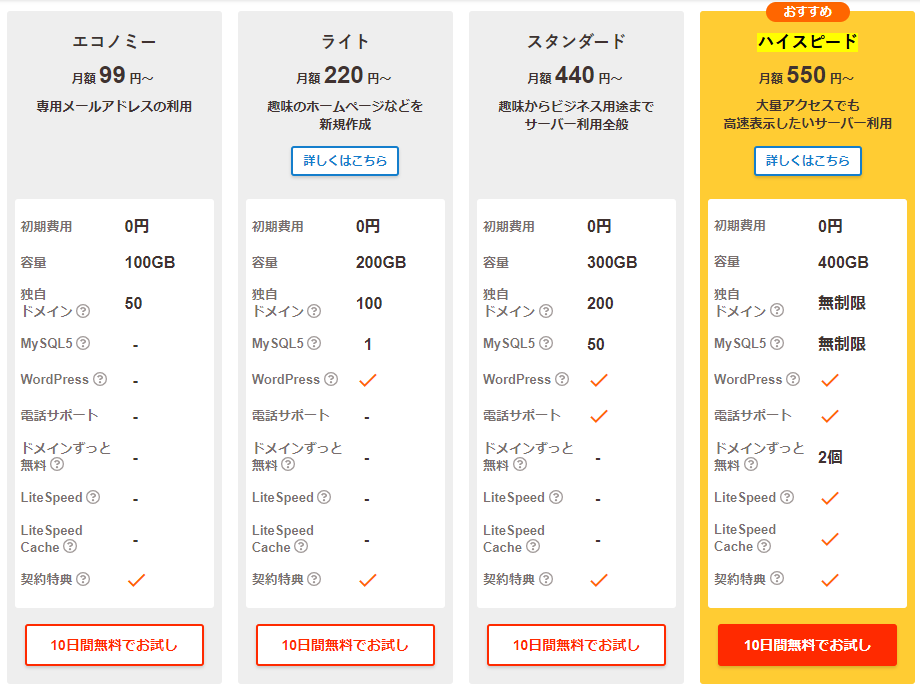 そして、使用するプランの個所で、「10日間無料でお試し」をクリックします。
