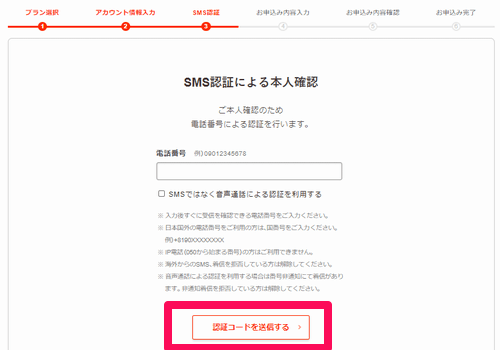 自分の電話番号を入力して、「認証コードを送信する」をクリックします。