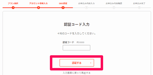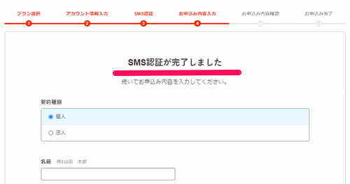 認証が成功すれば、「SMS認証が完了しました」という画面になるので、情報を入力して、「お申込み内容確認」のボタンをクリックします。