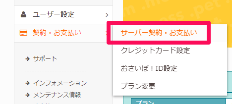 ログインをしたら、サイドバーにある「契約・お支払い」の中にある、「サーバー契約・お支払い」をクリックします。