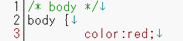まず、colorで指定する箇所を、「red」にしてあげることによって、ホームページ全体の文字の色を赤くすることができます。