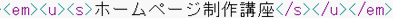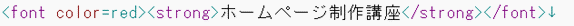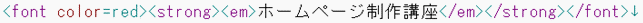 ・ 文字の色を変更するには、 <font color="red"> のように font タグを使用する ・ 文字を太字にするには、 <strong> を使用する ・ 文字を斜めにするには、 <em> を使用する ・ 文字に下線を入れるには、 <u> を使用する ・ 文字に打ち消し線を入れるには、 <s> を使用する ・ 文字のサイズを変更するには、 <font size="4"> のように font タグを使用する ・ 文字のサイズを変更するには、 <span style="font-size:15pt;"> という 書き方もある ・ 項目を作るには、 <h1> や <h2> を使用すると良い(SEO対策になる) ・ 段落を表すには、 <p> を使用する ・ <strong> や <h1> は重要なタグであると検索エンジンが認識するため、 SEO対策になる ・ font や strong タグなど、よく使うタグは辞書ツールに登録しておくと便利である