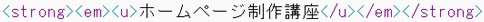 ・色を変更する方法(font color) ・文字を太字にする方法(strong) ・文字を斜めにする方法(em) ・文字に下線を入れる方法(u) ・文字に打ち消し線を入れる方法(s) ・文字のサイズを変更する方法(font size) ・項目、コンテンツを作る方法(h1、h2) ・段落を作る方法