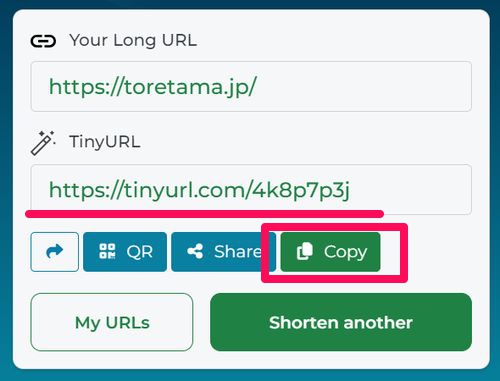 短縮URLが作成されるので、「Copy」ボタンをクリックして使います。